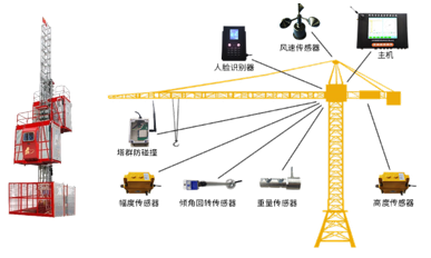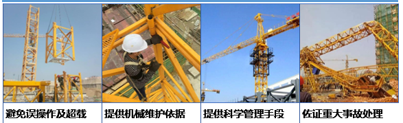 通过安装安全检测仪于升降机、塔机内,实时协助识别载重、驾驶员身份、实时高度及运行速度、驾驶室门锁状态、倾斜度,并实现实时内部抓拍,及时通过GPRS实时数据上传至远程监控中心,实现远程监管、超限自动报警、塔群碰撞监控等多种功能。